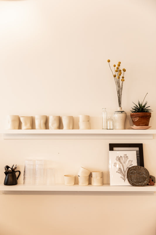 Ces gobelets de porcelaine ultra fins évoquent le papier froissé. Imaginés pour faire écho à la vocation de reproduction d'oeuvres d'arts d'artistes des Îles de la Madeleine.